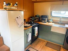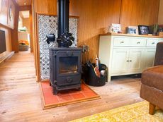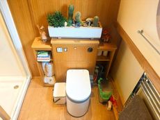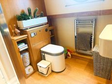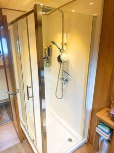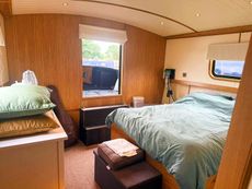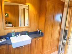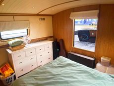 Stepping into the cabin from the stern deck takes you into the galley area. Here you will find stylish green units complimented by the oak worktops and plenty of storage space. Other features include a Belfast sink with Butler & Rose swan neck tap, 12v Shoreline fridge/freezer, Rangemaster double gas cooker with electric grill and washing machine. At the end of the galley is a breakfast bar with 2 bar stools. This then leads into the saloon area which offers plenty of room for freestanding furniture but currently features a double PVC leather sofa bed with pouffe, sideboard with solid oak top, 42″ HD TV and a Morso Squirrel solid fuel stove. Moving forward down the corridor takes you to the 2nd bedroom currently fitted to ‘L’ shaped bunk beds but this room could easily be re-configured to take a fixed double bed or even turned into a a permanent home office space. The bathroom is nicely fitted with solid oak cabinet doors with marble worktop, into which is inset a large ceramic handbasin. The bathroom also features a rectangular shower cubicle with twin heads and a pump out macerator toilet. Towards the front of the cabin is the carpeted master bedroom. the fixed double bed provides easy access to ample storage underneath. Further storage is provided by a large chest of drawers and a 4 door wardrobe. Bow doors then lead out onto the front well deck which is big enough to accommodate a couple of chairs if so desired. The well deck also houses the 2 x 75ltr reserve drinking water tanks.