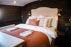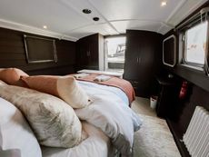 The interior layout is in the reverse style, entering from the stern takes you into the open lounge area. This offers storage space in cupboards and under steps, plenty of room for freestanding furniture, TV and a nice focal point being the cosy solid fuel stove. A breakfast bar backs on to the lounge and opens into the ‘U’ shape kitchen. This is equipped with a fridge/freezer, oven, grill, 3 burner hob, microwave and dishwasher. Moving forward take you to the off-corridor bathroom with large walk-in shower cubicle, Vetus pumpout toilet, handbasin and storage. At the front of the cabin is the bedroom with fixed double bed, wardrobes, drawers and bedside cupboard. Doors then lead out onto the spacious front well deck.